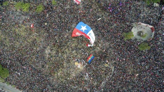 As fotos que mostramos são flagrantes de um vídeo que circula no Facebook e mostra uma multidão incalculável nas ruas de Santiago, capital do Chile.