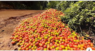 A foto ilustrativa é de autoria do G1 da Rede Globo, e mostra uma pilha de tomates lançada na margem de uma rodovia vicinal do estado de São Paulo e colocadas ali para provocar escassez e ter o preço aumentado.