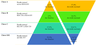 Nas cores expressas na pirâmide acima, as cores marrom, vermelho e amarelo somadas, representam 82% da população. Desse extrato, 66% das famílias ganham até R$ 2.034,00, aí incluídos os desempregados e subempregados.