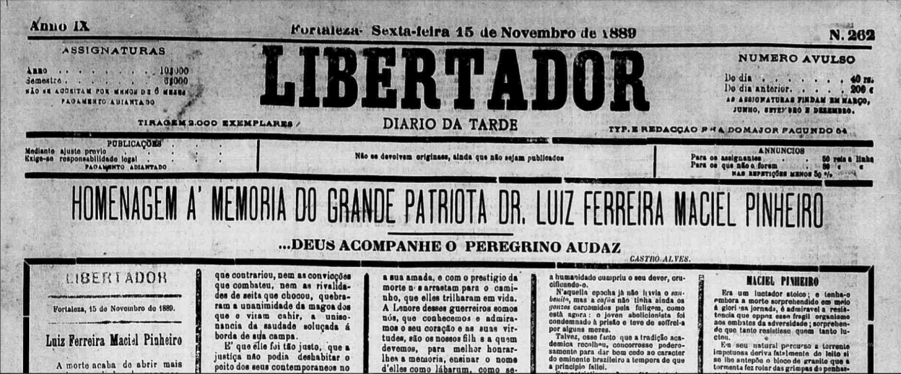 “em toda a imprensa brasileira não há um homem igual. Há outros que escrevem com mais imaginação e, portanto, com mais brilho […] Não há nenhum, porém, cuja pena corte, como uma espada afiada, como a dele […] Em Maciel Pinheiro o jornalista é o homem. Pobre, combatido por uma enfermidade cardíaca, pai de família que, a presente, de um dia para o outro ficou ao desamparo, ele quer morrer na imprensa como José Bonifácio morreu na tribuna. […] Estudante ainda, Maciel partiu para a guerra do Paraguai como voluntário da pátria, o Castro Alves, que conhecia pela atração que sentia por ele[…] deixou o nome do seu companheiro soldado gravado nas suas belas estrofes”