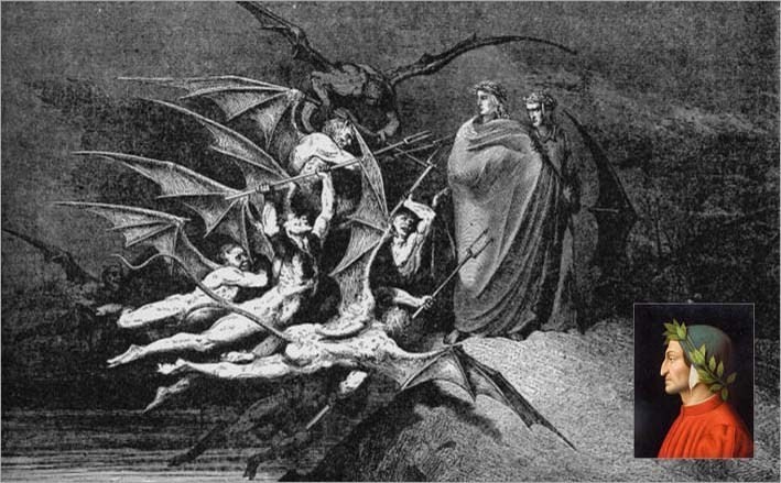 Dante Alighieri escreveu em 1472 e encenou a Divina Comédia dividida em três partes: o inferno, o purgatório e o paraíso onde ele descreve o inferno como nove círculos de sofrimento localizados dentro da terra.