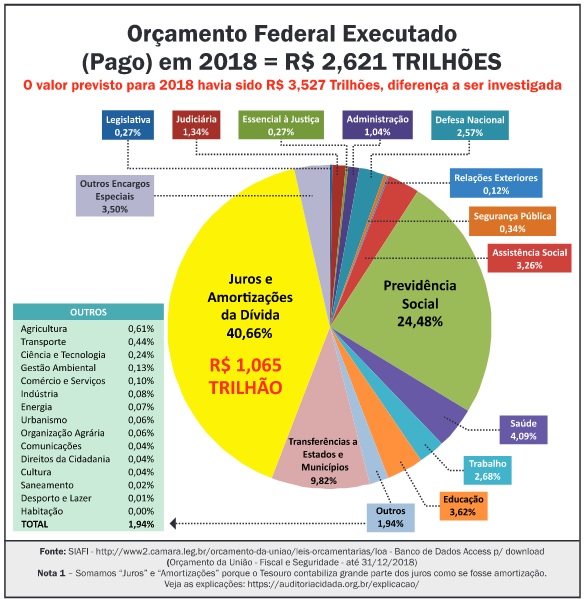 Se olharmos para as execuções orçamentárias de 2018 e 2019, veremos clara e nitidamente a sangria desatada que se processa ano após ano na peça orçamentária para atender a hemorragia da dívida pública.