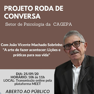 Hoje recebemos um honroso convite que nos foi feito pelo Dr. Luiz Célio Rangel, Psicólogo dos quadros da CAGEPA, o qual organiza no âmbito daquela empresa e com acesso público, uma série de palestras e debates denominada: RODA DE CONVERSA, para proferir palestra por meio digital cujo tema da semana é: