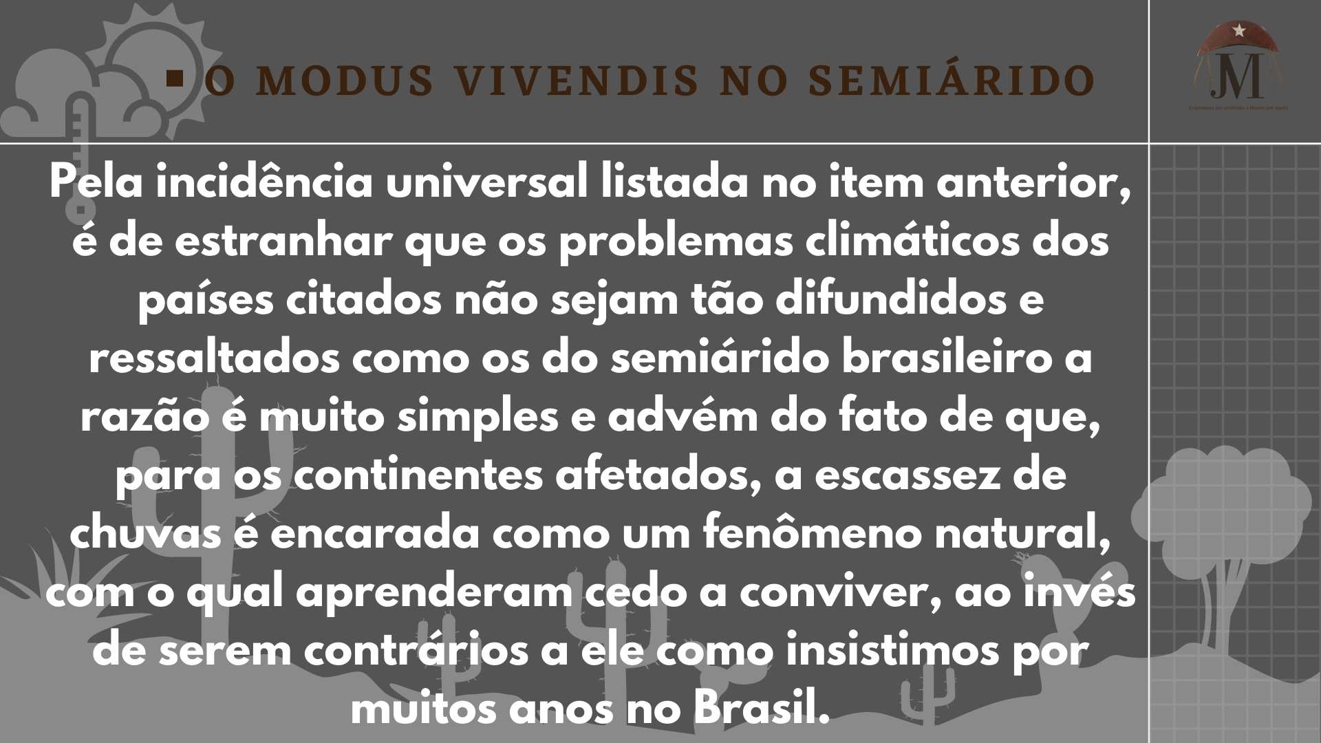 Maria Rita nos traz um apanhado resumido, que pesquisou sobre o semiárido e mostra na sua pesquisa, a existência de outras regiões semiáridas do Planeta, inclusive o nosso Brasil, que possui uma grande diversidade de fauna e flora e é a região com esse tipo de clima, mais habitada do planeta Terra.