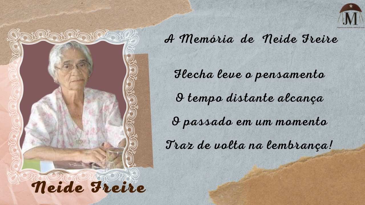 Falar sobre a intelectual, poetisa, educadora, conterrânea e amiga Neide Freire é uma tarefa prazerosa, porém, lembrar Neide Freire é uma tarefa dolorosa e saudosa. Nunca encontrei ninguém tão feliz e risonha quando falava da sua infância em terras lavrenses: seu berço natal. Criança amada, adulta batalhadora, foi Neide poetisa de grande sensibilidade, educadora dedicada, mãe amável e amiga dedicada. Neide não falava apenas com os lábios, falava com a voz do coração e em som alto e melodioso.