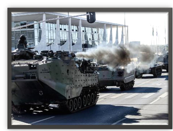 Voltando ao Brasil atual, às arruaças, às bravatas e às ameaças do Presidente da República, que no dia 10/08/2022 protagonizou uma pantomima grotesca num picadeiro armado na praça dos três poderes em Brasília. Assistiu o desfile de quatro ou cinco tanques de guerra, acompanhados de um punhado de apoiadores fanáticos, uma verdadeira claque de seguidores, provavelmente acometidos da Síndrome de Estocolmo, num propósito belicoso nitidamente intimidatório aos demais poderes Legislativo e Judiciário, que compõem o tripé de poderes desenhado por Montesquieu, um filósofo iluminista francês.