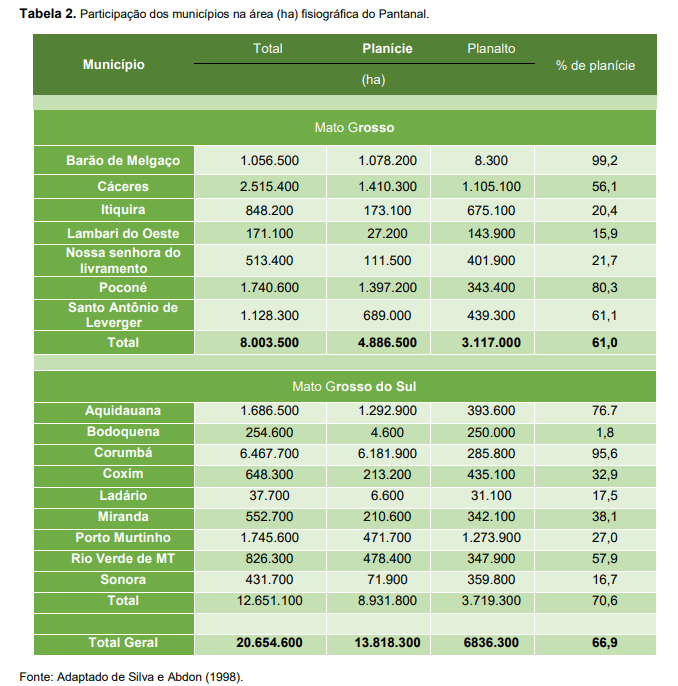 A segunda tabela apresentada pela EMBRAPA, mostra além da área total dos municípios, as áreas referentes à planície e ao planalto.