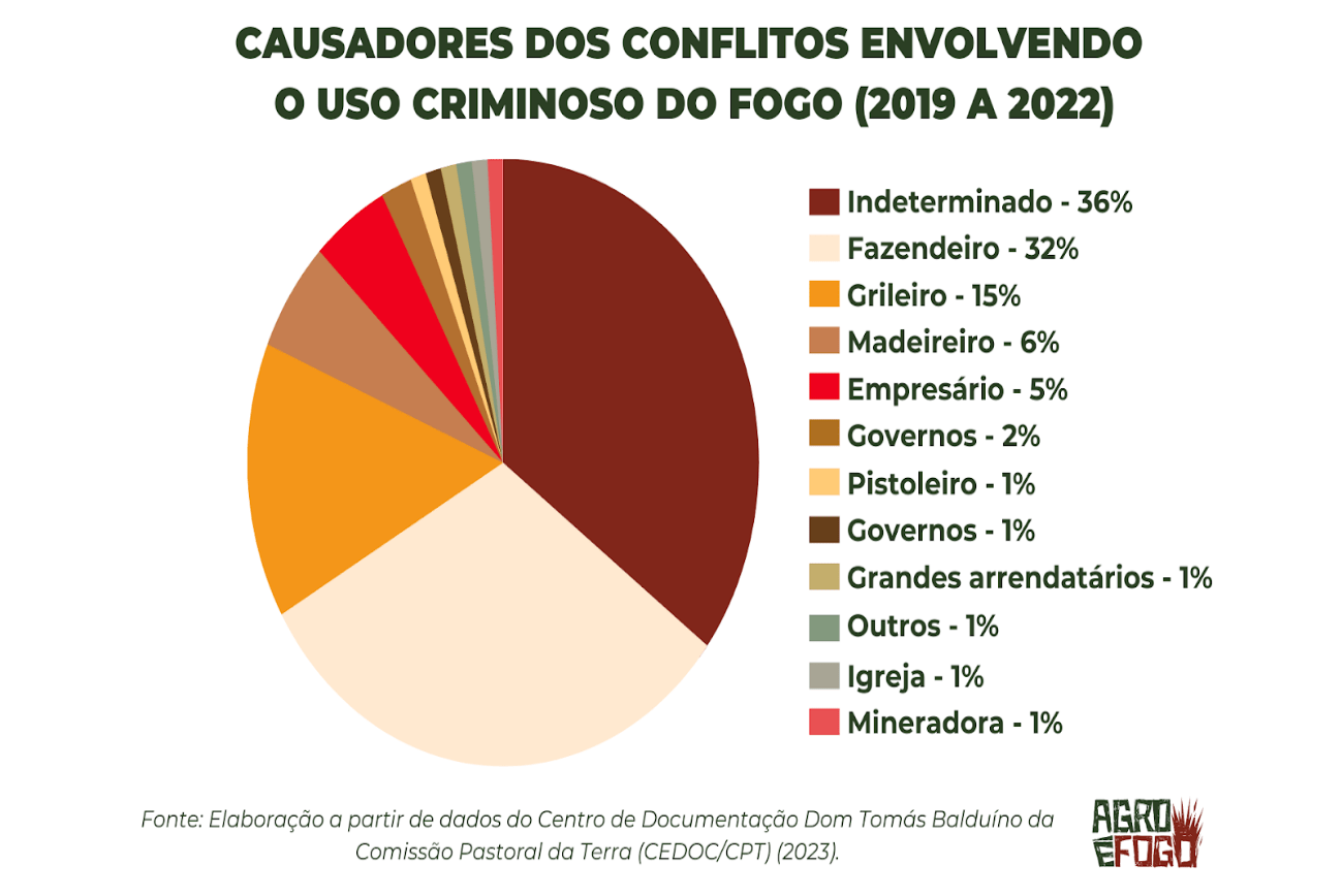 Nela 36% dos incêndios ocorrem por “causas indeterminadas;” 32% causados por fazendeiros; 15% causados por grileiros, 6% causados por madeireiros e 5% causados por empresários. Afora a arraia miúda que teria causado 8% dos incêndios
