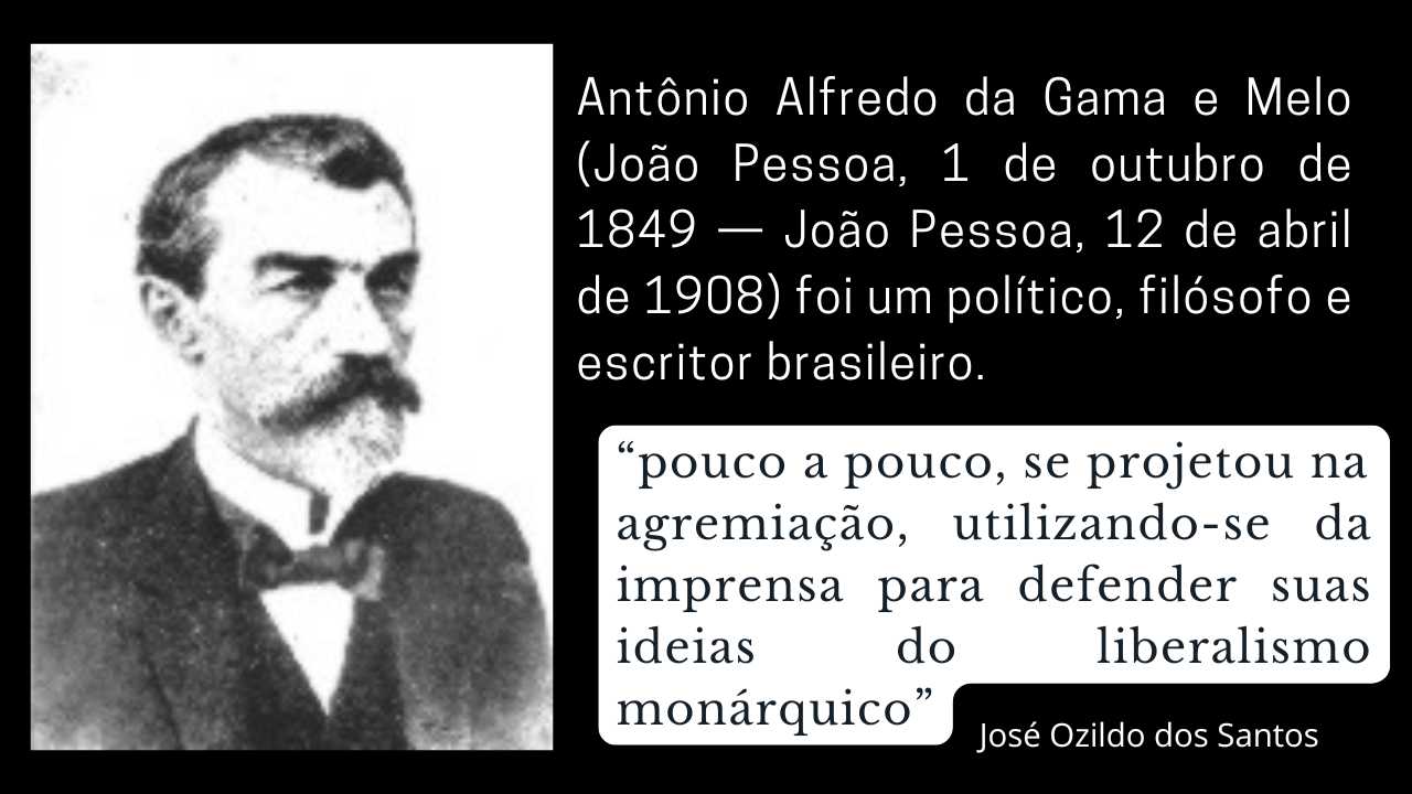 Volvendo aos primórdios da República e início do Século XX, encontramos na presidência deste Estado o paraibano nascido nesta capital, Antonio Alfredo da Gama e Melo que antes, na qualidade de vice-presidente da Província, nomeado pela Carta Imperial de 1880, assumira por cinco vezes os seus destinos. Era acusado pela oposição de trabalhar em surdina pela restauração, isto é, a volta da Monarquia, à qual servira no passado. Em batalha permanente com a Assembléia, conta no Jornal do Comércio do Rio, um anônimo C.A., seu propósito de “vingança contra os republicanos”. O diário O Commercio, órgão dirigido por Arthur Aquilles, transcreve o artigo na página 2, da sua edição de 8 de maio de 1900: