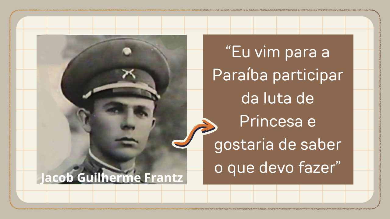 O Palácio do Governo da Paraíba que já fora denominado Palácio da Presidência e, não era ainda da Redenção, passava por mais uma reforma, nos idos de 1930. João Pessoa, o presidente, despachava em uma dependência do jornal A União que ficava, então, à esquerda da praça Comendador Felizardo, hoje, João Pessoa. Seu ajudante de ordens era o coronel Elísio Sobreira que também respondia pelo Comando da Polícia Militar. De repente, chega à antessala do gabinete improvisado, um galego bem vestido, de gravatinha de laço, voz estridente e sotaque estrangeirado, apresentando-se: Jacob Guilherme Frantz. Disse a que vinha: “Eu vim para a Paraíba participar da luta de Princesa e gostaria de saber o que devo fazer”. Consultado, João Pessoa mandou avisar que não dispunha mais de nenhum posto comissionado na Polícia, para lhe oferecer. O voluntário ponderou que não falara em comissão nem em dinheiro, estava ali por idealismo e no propósito de ajudar ao governo.