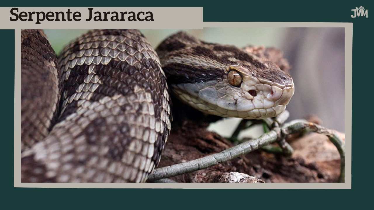 Cobra Jararaca: trata-se de uma serpente peçonhenta de tonalidade de cores que variam do marrom escuro ao claro, verde, acinzentada ou amarela. O macho pode atingir 1m e a femea 1,5 m de comprimento.