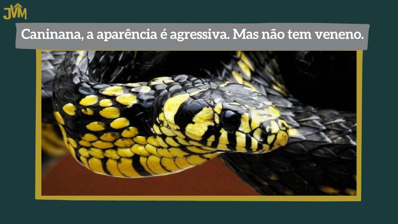 Caninana: é uma serpente não venenosa muito comum na América do Sul. A sua cor é mesclada entre os tons preto e amarelo. É ágil e veloz, podendo atingir até 2,5m de comprimento. Tem a fama de ser agressiva em virtude da sua postura defensiva contra os predadores, mas somente ataca quando é agredida. Em que pese a sua picada ser inofensiva.