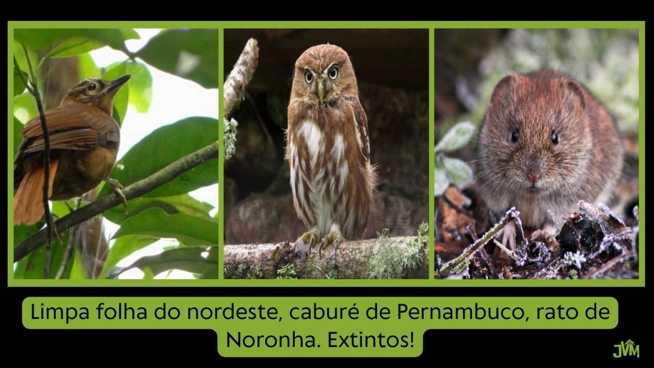 Na fauna brasileira, em que pese o Brasil ser um país ainda muito jovem, a lista de animais extintos e em extinção é considerável. Essa é uma prova inconteste da ação predatória humana. Exemplos não nos faltam de animais extintos tais como: a limpa folha do nordeste, o rato de Noronha, o caburé de Pernambuco. Além daqueles animais que estão em processo de extinção como: arara juba, boto cor de rosa, baleia franca do Sul, gato maracajá, jacutinga, gato maracajá, mico leão dourado, lobo guara, entre outros.