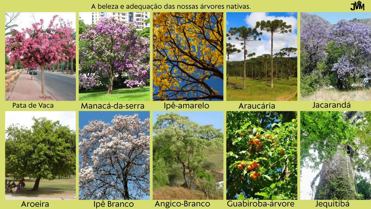 . Árvores nativas: são aquelas que crescem naturalmente nos diversos biomas terrestres, sem a intervenção da mão humana. Em sendo naturalmente adaptadas, elas são fundamentais para o equilíbrio ecológico, fornecendo alimento e abrigo para a fauna local, além de adubo natural para as demais espécies.