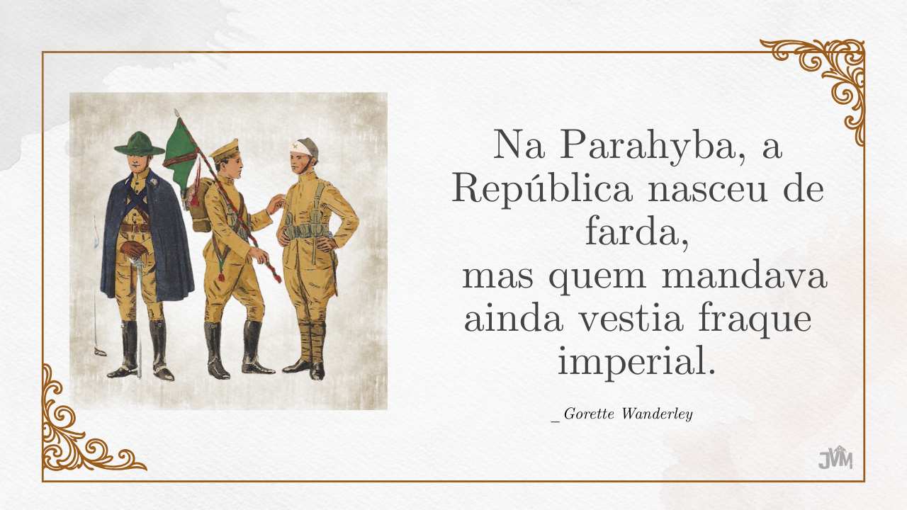 A notícia da deposição da Família Real chegou à Parahyba por telegrama. A República estava nascendo, mas por aqui, não havia um republicano para recebê-la. O paraibano Albino Meira, professor da Faculdade de Direito do Recife e único defensor da República entre nós, foi candidato à Assembleia Geral do Império e obteve míseros vinte e quatro votos. Confirmado o golpe militar comandado por Deodoro da Fonseca, assumiria a chefia do executivo o tenente-coronel Honorato Caldas que por doze dias tumultuados, se fez governador. Terminou preso e recambiado para a antiga Corte por ordem de Benjamim Constant, ministro da Guerra. Passou o governo ao capitão Oliveira Cruz, até a posse do governador nomeado, Venâncio Neiva, juiz de Catolé do Rocha. Este, irmão de dois oficiais do exército, teve sua indicação reforçada pelo general Almeida Barreto e venceu Albino Meira, republicano histórico, patrocinado por Aristides Lobo, Ministro do Interior do governo provisório.