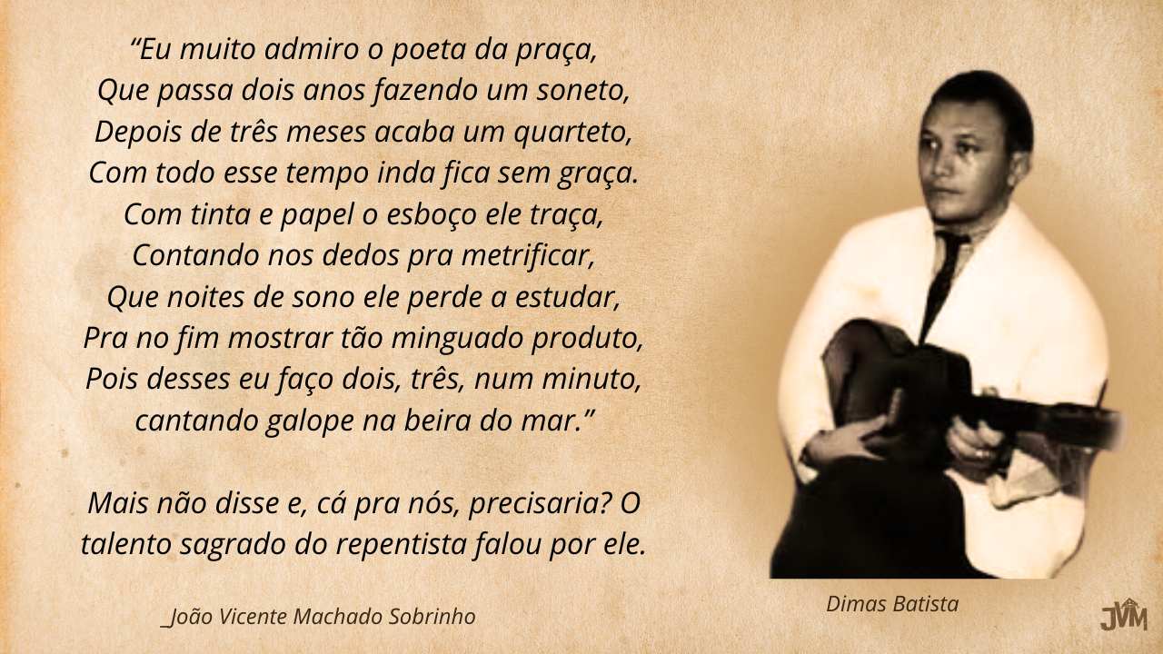 Dimas, provavelmente, incomodado com o preconceito de algum poeta de bancada arrogante que se encontrava no recinto, fugiu do seu habitual cavalheirismo e foi obrigado a abandonar a modéstia para produzir essa pérola, em desagravo aos colegas repentistas como ele: