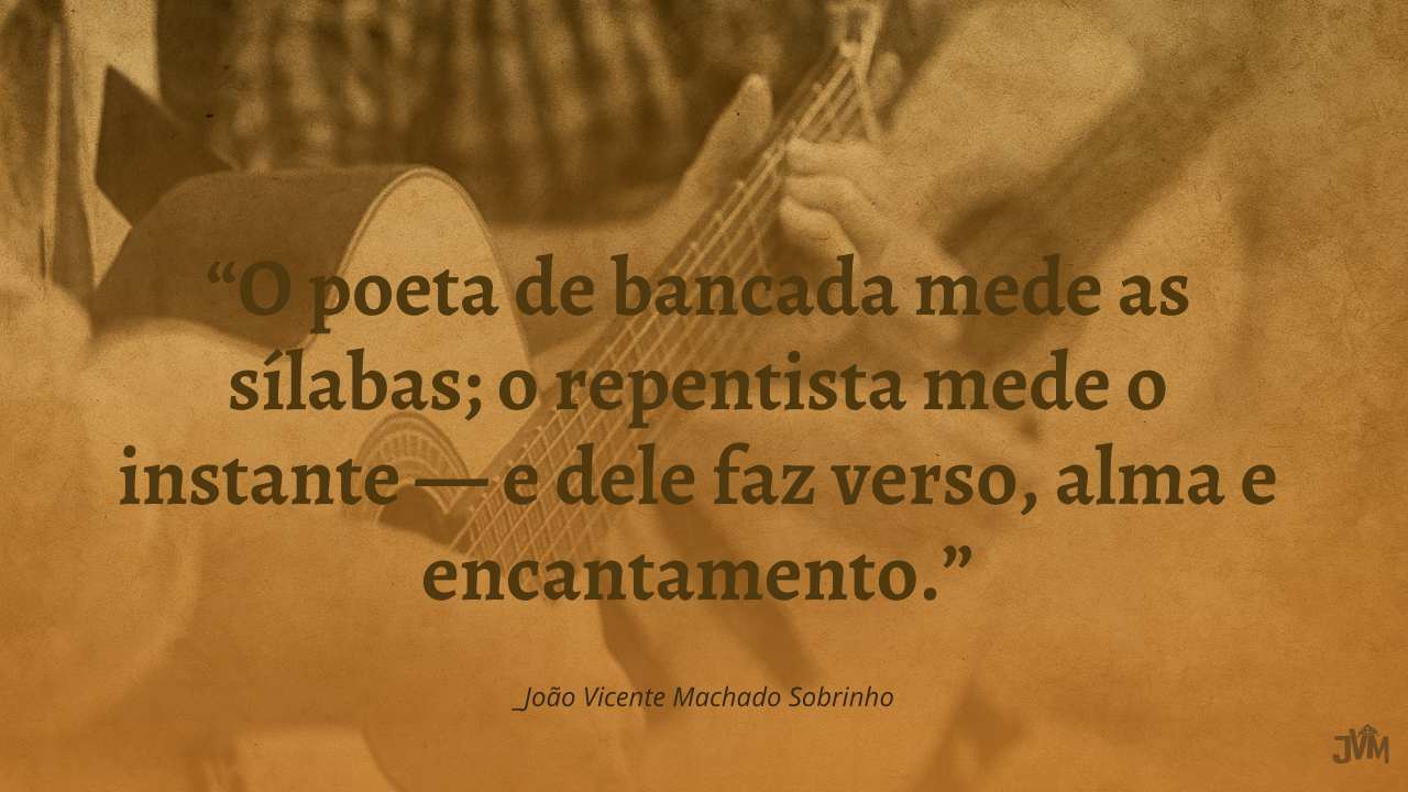 Mas o poeta de que lhes falo com insistência é indescritível e, somente presenciado com muita atenção o malabarismo dos seus versos para perceber o seu talento incomum. Quando um repentista canta, parece alguém com ânsia de vômito, vomitando incontrolavelmente as palavras, formando os versos e, pasmem, muitos deles, jamais frequentaram uma escola, mesmo por pouco tempo.