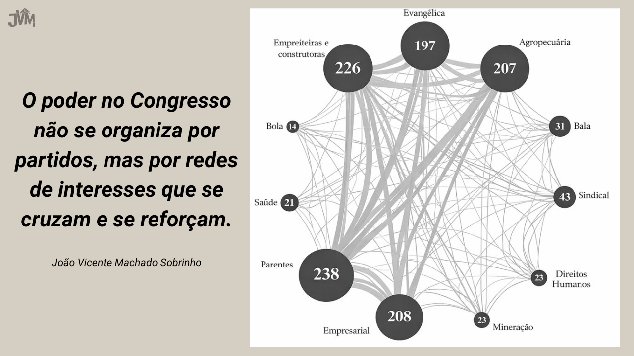 Essa quantidade enorme de siglas partidárias, -vinte e nove ao todo- têm como única finalidade, acomodar interesses diversos de bancadas diversas. São algodão entre cristais e formam uma verdadeira colcha de retalhos de interesses da classe dominante, e interagem de forma cruzada: ruralistas, evangélicos, empresários, empreiteiras, da bala, da bola, feminina, da educação, do jaleco, LGBTQIA+, parentes, sindical etc.