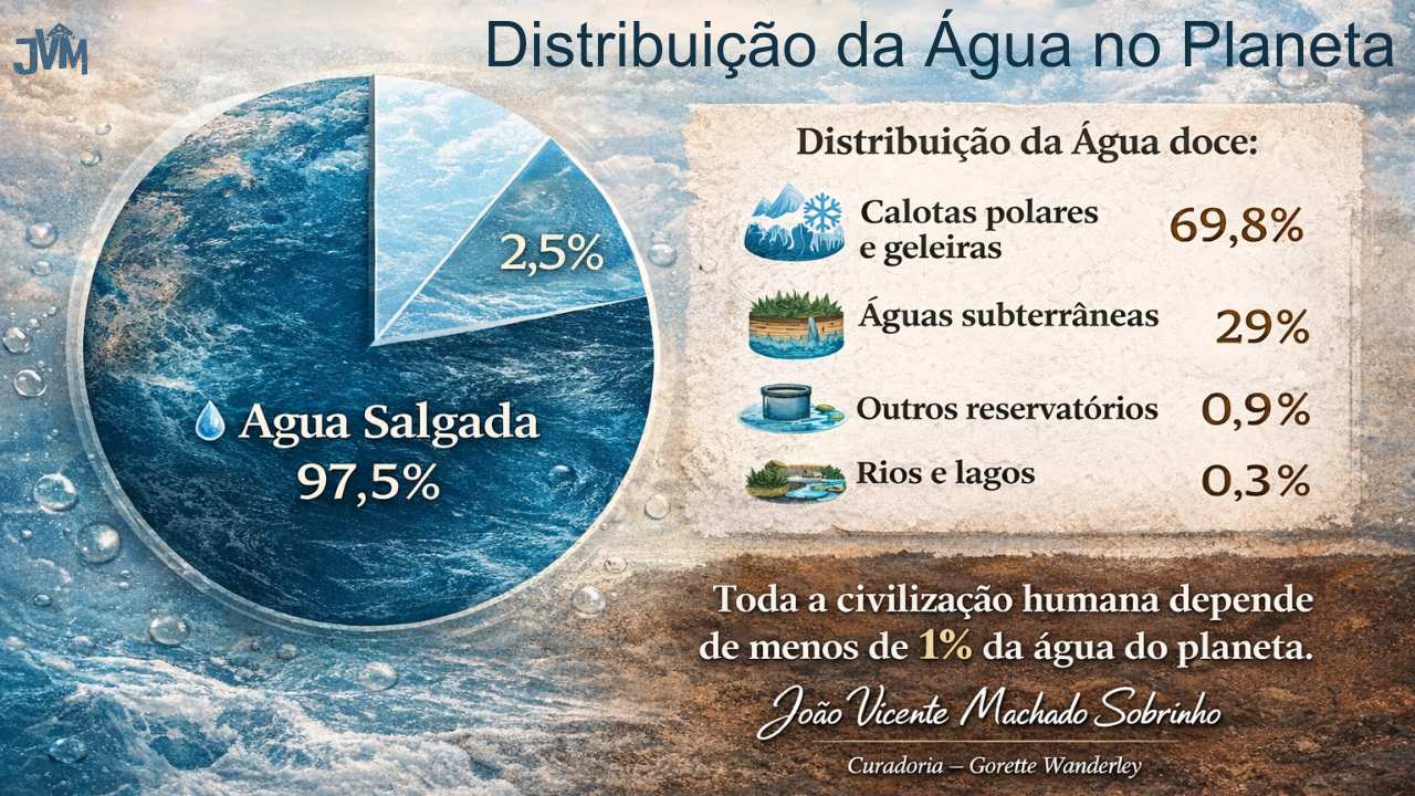 O iconográfico anterior é uma demonstração visual muito clara,  de que a água doce disponível no planeta terra, representa apenas 2,5% da totalidade do planeta, com menos de 1% diretamente acessível para o uso humano e animal (UNESCO, 2023).