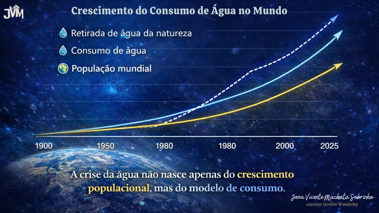 Para que tenhamos uma ideia de grandeza, entre os anos de 1960 e 2020, a retirada global de água doce da natureza, mais do que dobrou. Ou seja, enquanto a população cresce em ritmo mais ou menos aritmético, a demanda por água potável  cresce em nível mais ou menos geométrico, para uma quantidade total de água que é constante. Esses fatores, sem nenhuma dúvida comprometem a regularidade do suprimento e abastecimento, ampliando a insegurança alimentar e por conseguinte a existência. Consumo x População entre 1960/2025